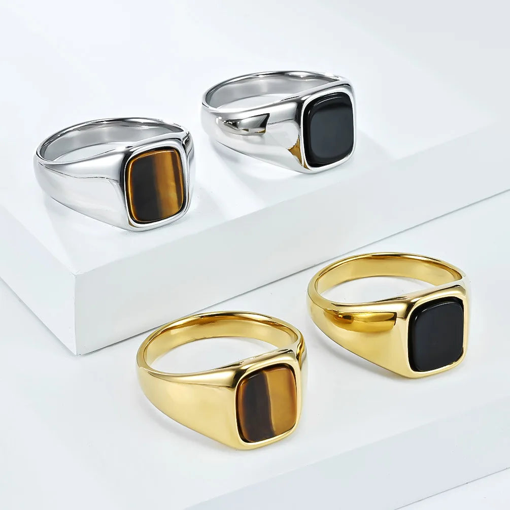 Elevate your style with a stunning blend of vintage charm and modern sophistication. This uniquely crafted signet ring features a captivating tiger eye inlay and a bold black stone centerpiece, making it a must-have accessory.